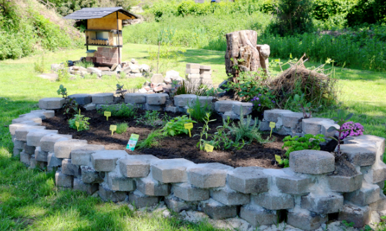 Inzwischen haben wir eine Kräuterspirale und ein Insektenhotel ergänzt.